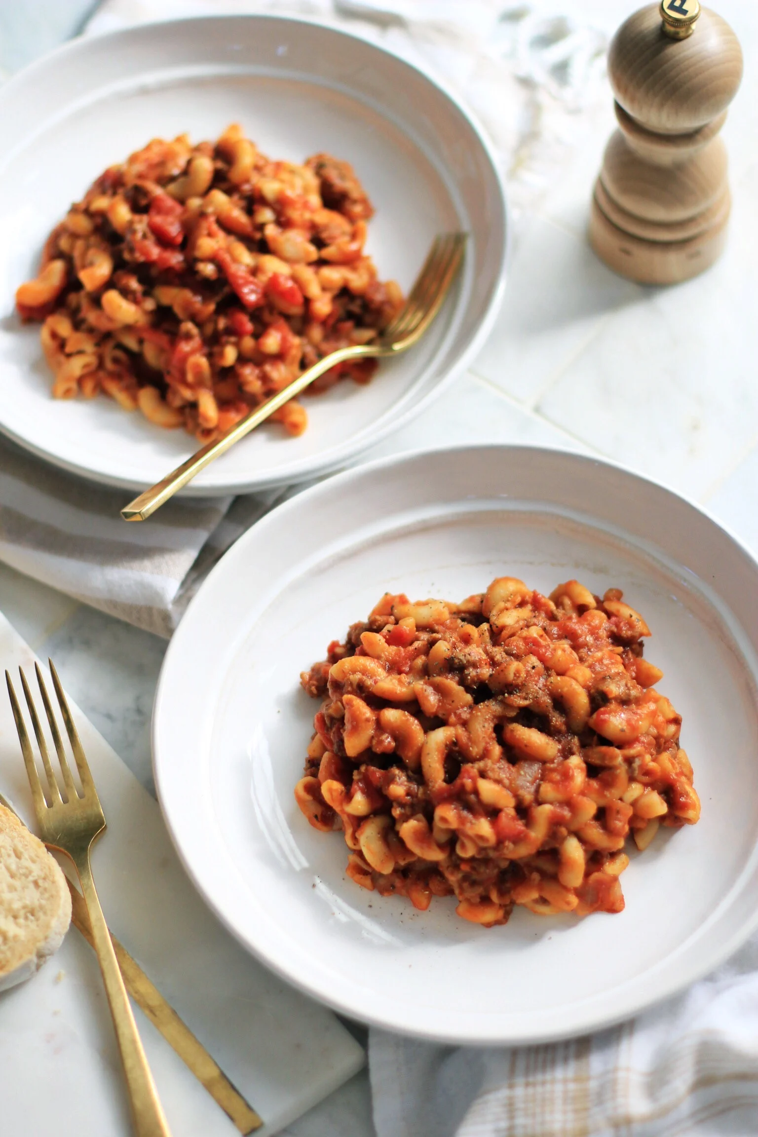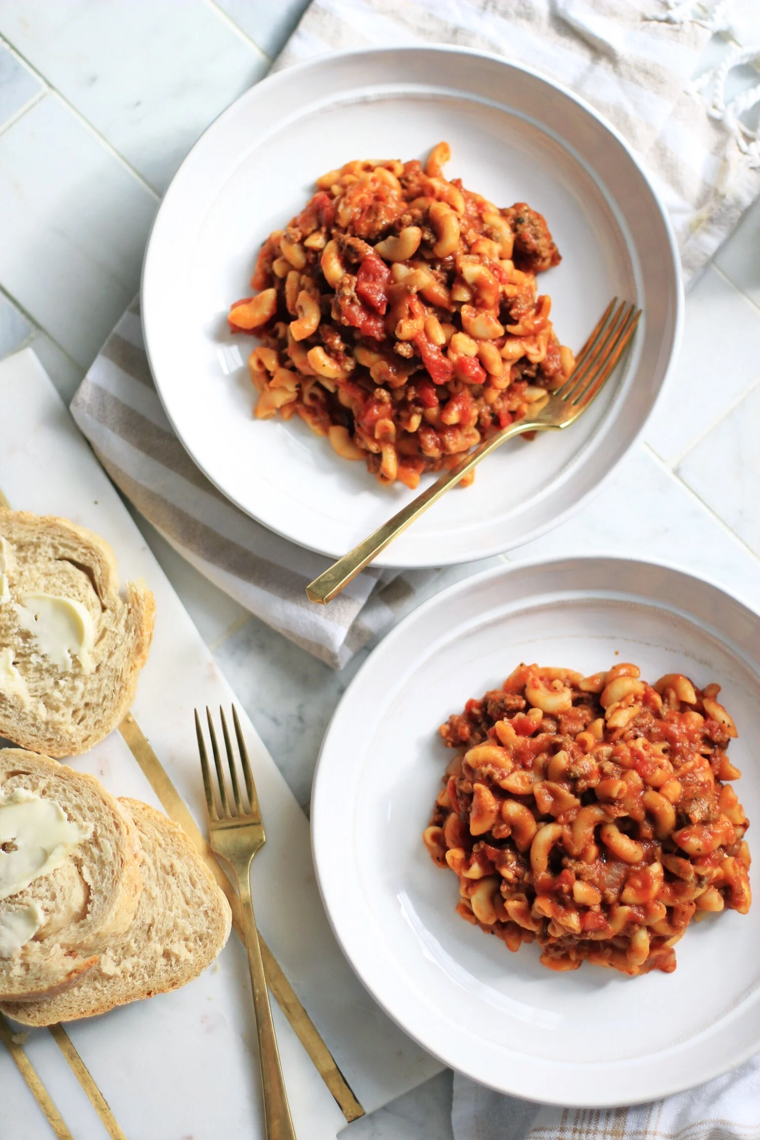 In a Dutch oven over medium heat, brown the ground beef and sausage, breaking up with a spoon as it cooks. When it’s cooked through, add in onion along with garlic powder, onion powder, dried basil, oregano, red pepper flakes, salt and pepper. Cook, stirring occasionally, until onions are soft and translucent, about 5-7 minutes. Add in garlic and cook for another minute until fragrant. Pour in tomato sauce, diced tomatoes, water, Spicy Hot Tom (spoon the tomato sauce from bottom of jar, leaving behind the oil), and Worcestershire, as well as bay leaves. Cover Dutch oven with lid and cook for 20 minutes, stirring a couple of times (mixture should be simmering or boiling very gently - lower the heat if boiling rapidly). After 20 minutes, add elbow macaroni, cover with lid again, and lower heat to medium-low/low for 20 minutes, stirring often to make sure noodles aren’t sticking to bottom of pan. Stir in sugar, and additional salt and pepper if you’d like. Off the heat, and serve right away if you’d like alongside buttered bread. However, I prefer to let it cool completely, refrigerate it, and then reheat on the stove over medium-low, adding a bit of water to the pan for consistency (it’s always better the next day!)