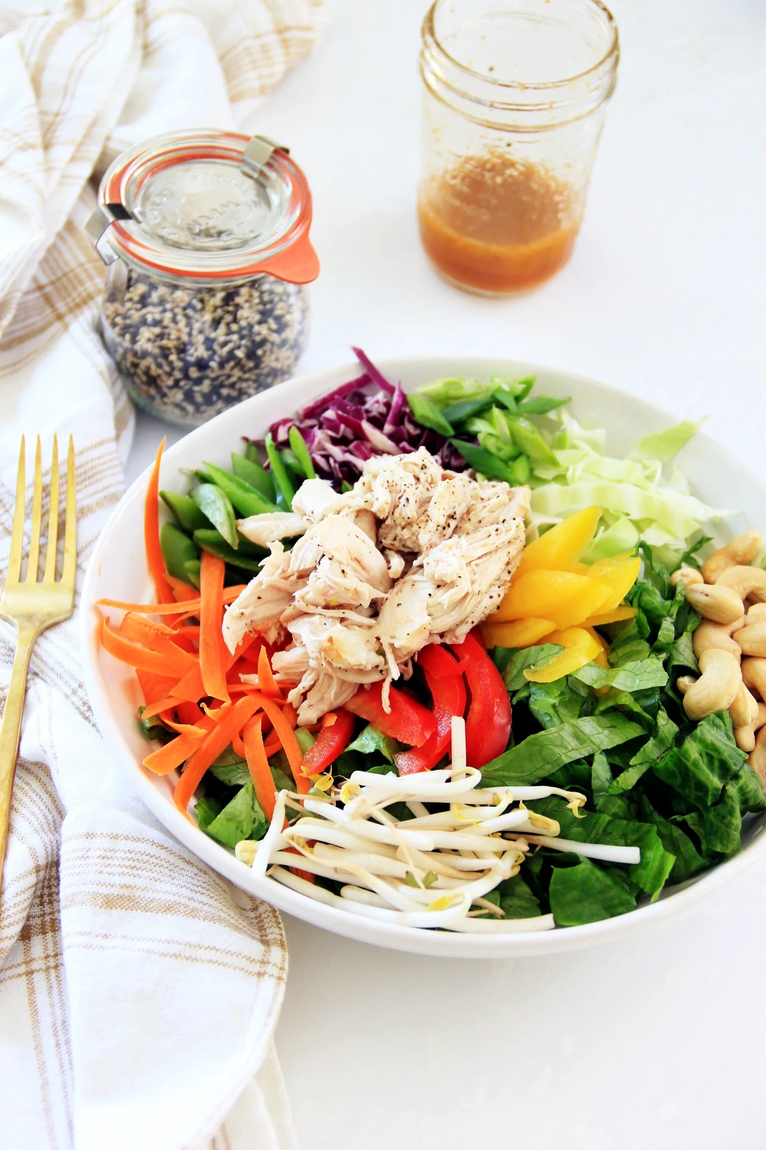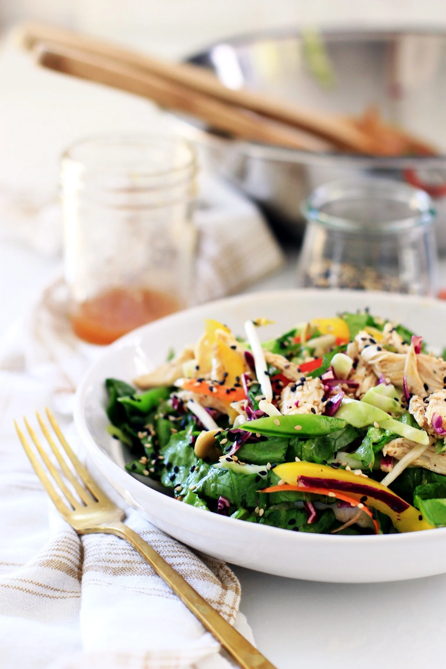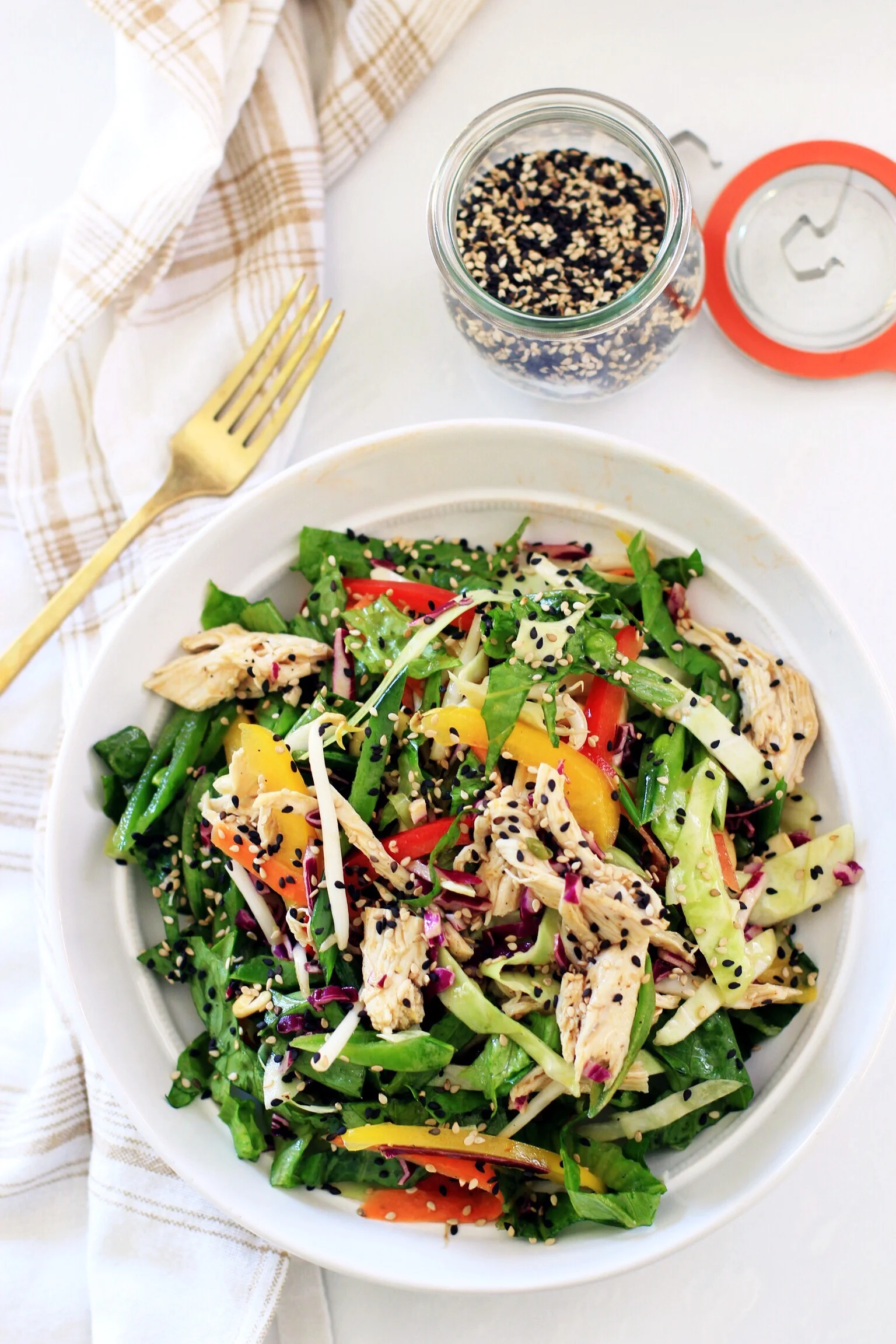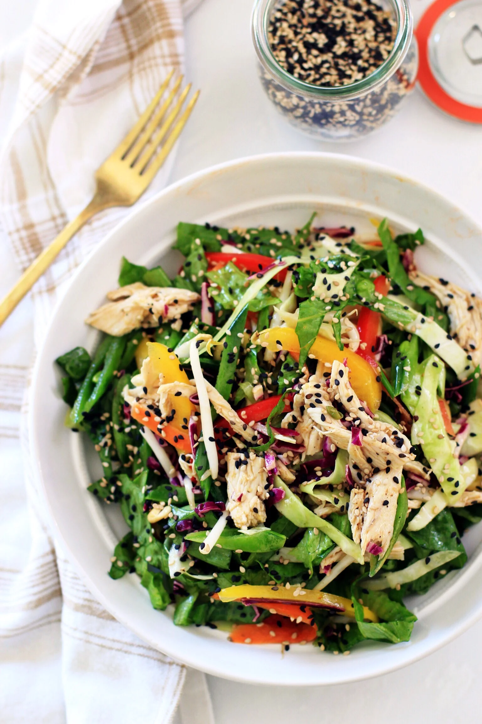 Combine lettuce, vegetables, and chicken in a large mixing bowl. If you’re eating all of it now, pour dressing over top, and toss well (or divide out the portion you’re saving for later before dressing). Taste for seasoning, and add salt and pepper if needed. Transfer to bowls or plates, and sprinkle with sesame seeds to finish. Note: Salad can be prepared and compiled in a container a day ahead - just wait to dress and toss until you’re ready to eat.