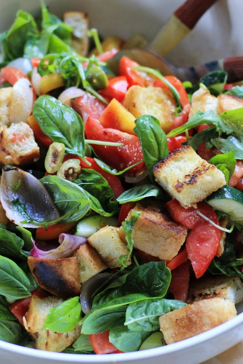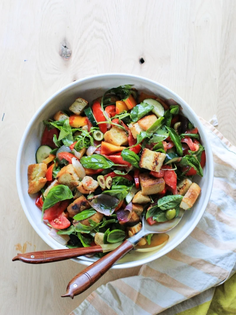 You can begin by making the dressing (which can be done a day ahead if need be). In a jar, combine ¾ cup olive oil, vinegar, Dijon, grated garlic, 1 tsp salt, and cracked pepper, and shake to emulsify. Set aside or refrigerate until ready to use. Then preheat the oven to 400 degrees. Place onion on a sheet pan and roast in the oven for 12-15 minutes or so until soft and charred in parts. Set aside to cool. Then heat a large saute pan and enough olive oil to coat the bottom of the pan over medium to medium-low heat. Add bread cubes in one layer and fry for a few minutes until golden, flipping over as needed. Repeat again as needed with additional batches of bread (you’ll like need to add more oil each time). Set croutons aside to cool on a plate. Then, in a very large mixing bowl, combine the cooled off onion, cooled off bread, tomatoes, bell peppers, cucumber, olives, arugula, and basil (salting a bit each layer to make sure everything is very well seasoned, plus some extra black pepper if you’d like). About a half hour to an hour before you’re ready to serve it, toss with half the dressing. Then, dress with the remaining dressing right as you’re serving it.
