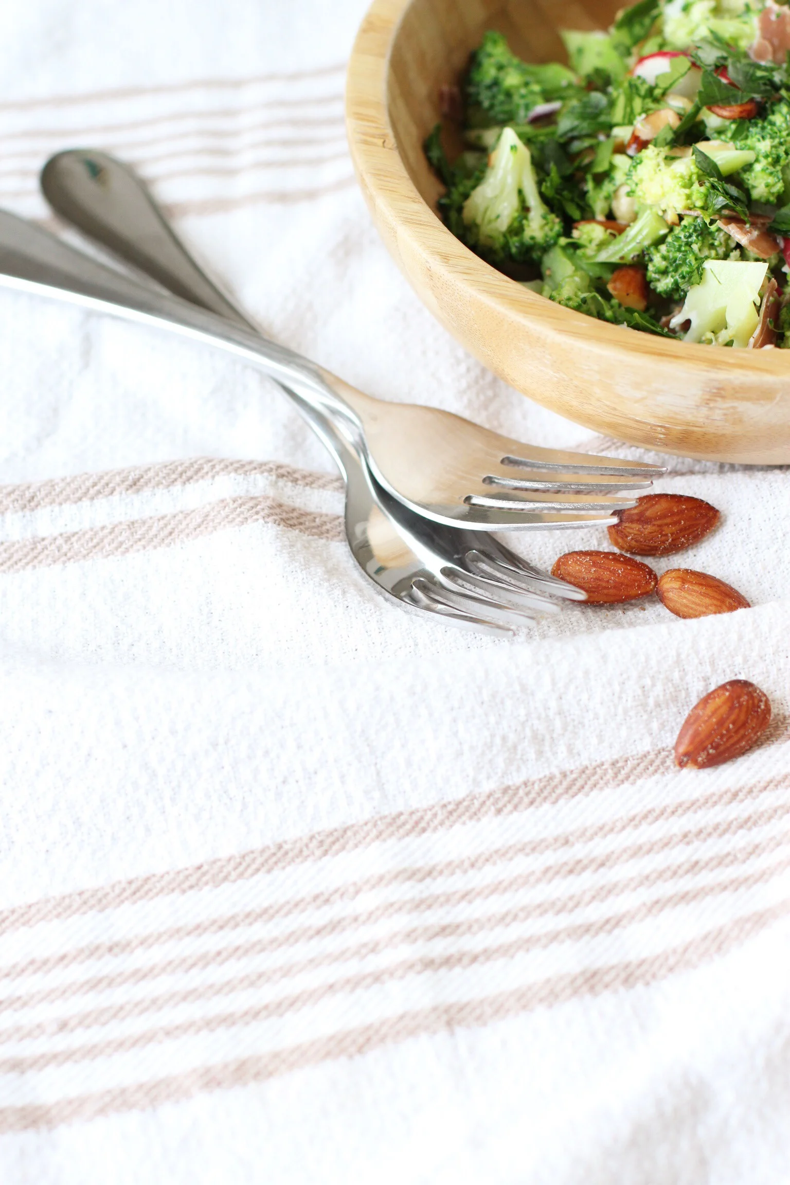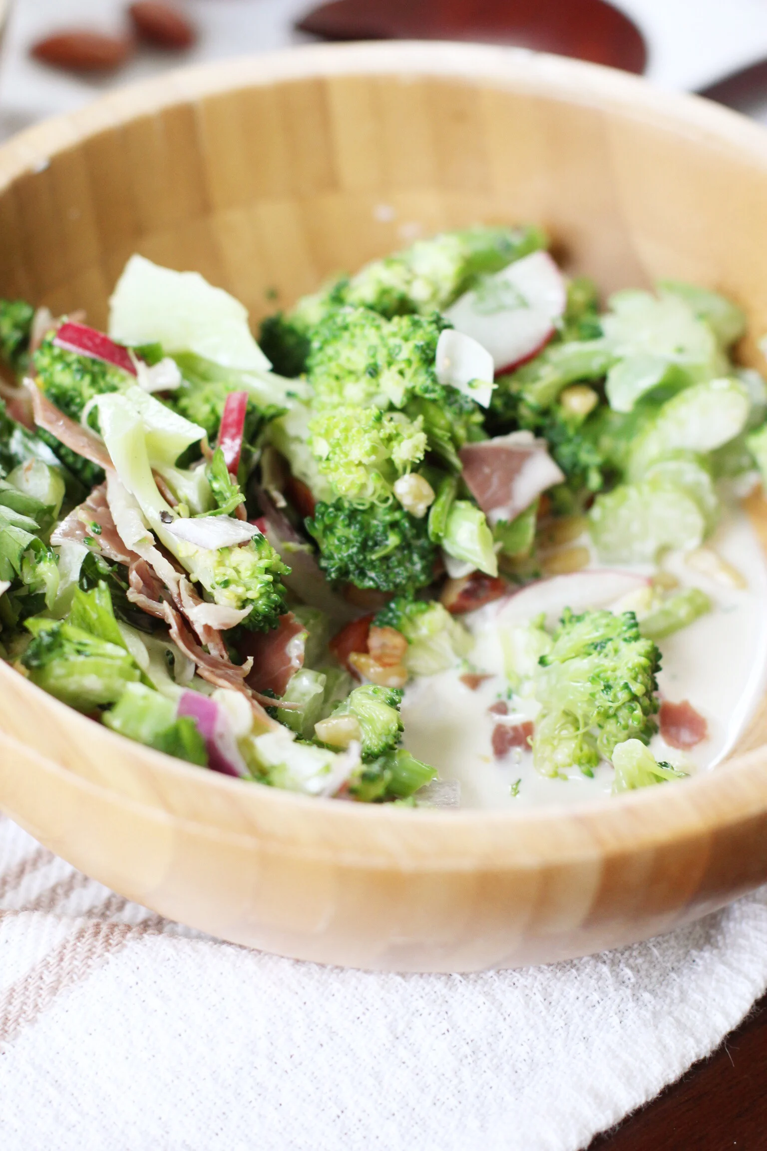 My love of unique make-ahead “salads” is well documented on the Pastiche, and the broccoli salad route is one I venture down fairly often but haven’t yet featured on here. And as is the case with so many of the salads I talk about, these are not hard and fast recipe rules—I often just use more of what I have on hand as opposed to buying all new ingredients. However, the general theme is this: I love a sweeter dressing on my broccoli salad because here’s what I DON’T love: raisins. Raisins are commonly found in broccoli salad, and although I existentially and theoretically respect that choice, I can’t, in reality, practice that choice. And so, I think a sweet sesame dressing is perfect here—creamy but light, and much thinner than other versions I’ve had. I also love an array of snaps, crisps, and crunches: i.e. radish, onion, celery, pine nuts, and salted almonds. And of course the savory, salty bite of pancetta, which tastes a little less meaty/fatty than bacon (although I’m certainly not going to scoff at bacon, either). A handful of chopped fresh parsley brightens everything up, which is also important to me with a creamy salad that can too often taste very heavy. I love this salad, and the ease with which it can be thrown together the day or night before, or in my case to help stave off the Sunday Scaries.