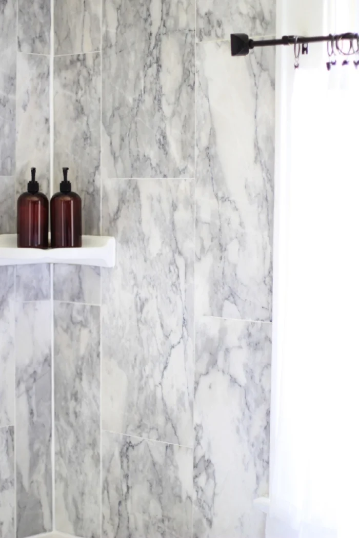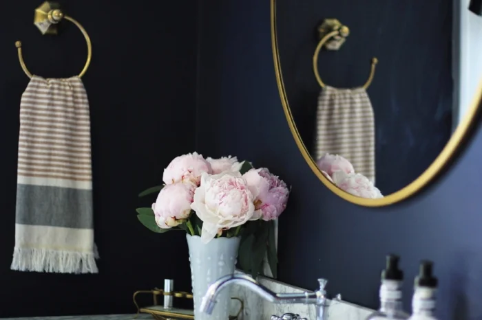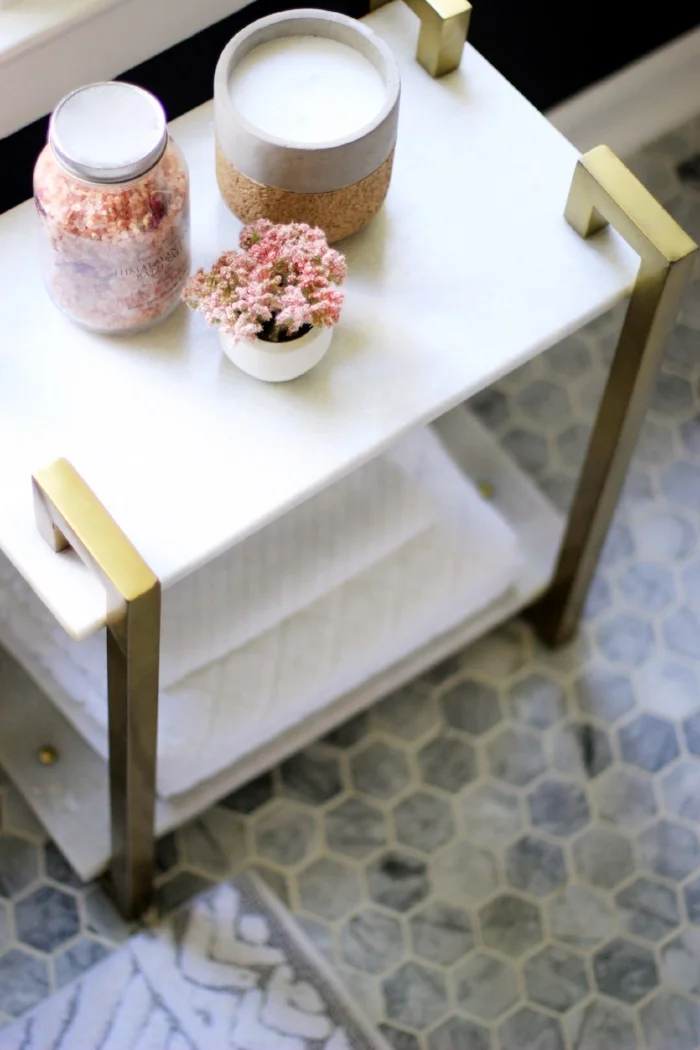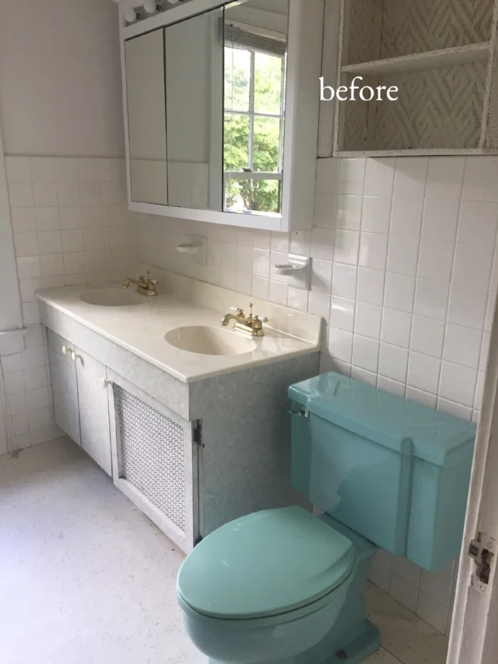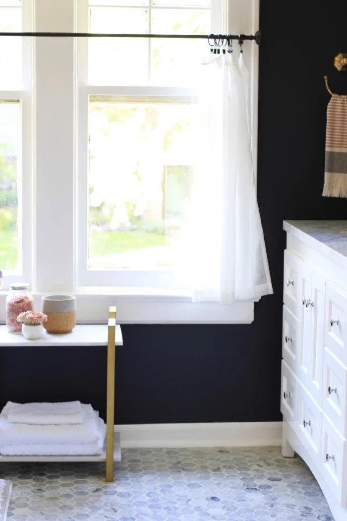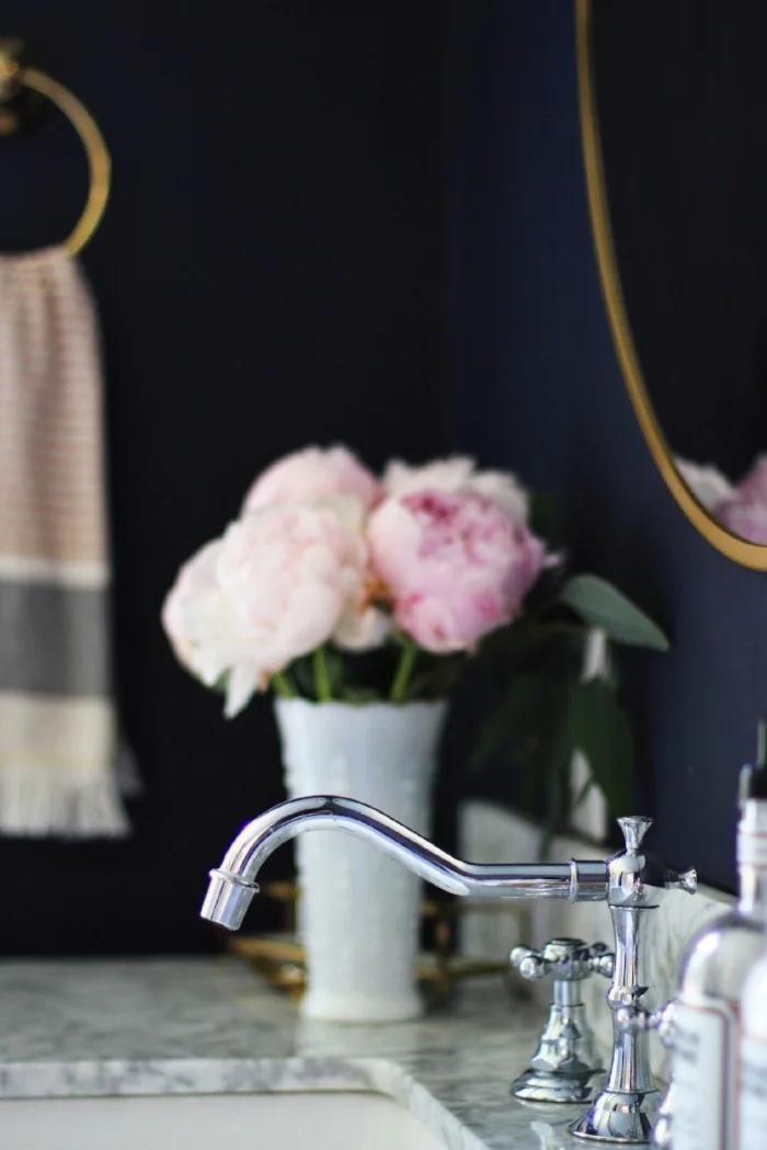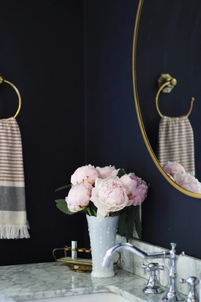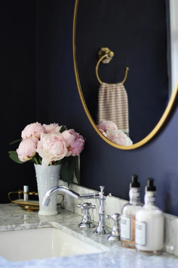 Above is the slightly less chic blue variety of our main bathroom upstairs a few months ago. It was simply dated and cold and in need of a makeover. So Jon and co. gutted the entire thing and rebuilt it (in the same footprint) with updated and warmer finishes, such as natural stone in the form of marble floors and shower walls. I envisioned it being all white in its finished state, but it still felt a bit cold and unfinished at that stage. So in a wild turn of events (and much to Jon's thrill; he's a little sick of all-white-everything), we tried a rich navy color on the walls and fell in love with how it looked alongside brass, black, and white. And the rest is history!