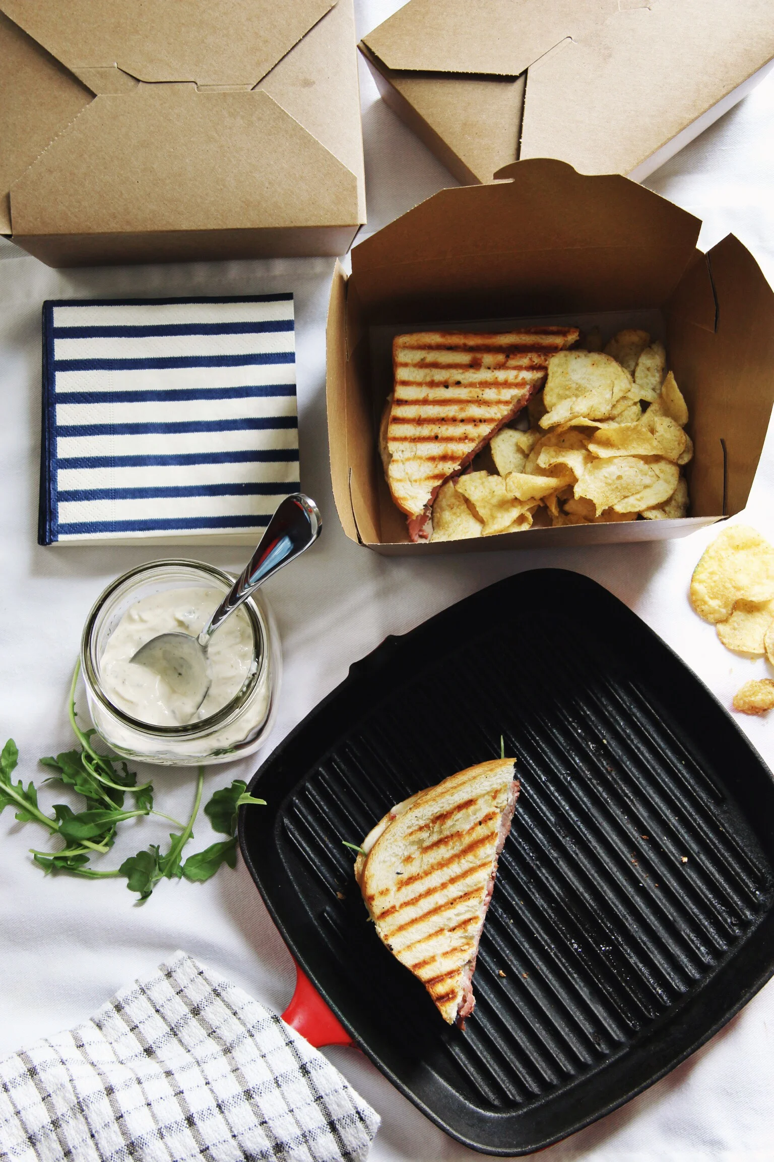 Jon is a man of many hats—one of the more common ones is workman. He has completely gutted and/or renovated and/or built out all three of his restaurants, and he really, really enjoys it. He is currently engaged in the overhaul of the kitchen at the bar, and on Sunday, he and two friends planned to work on it all day. I thought it would be nice to bring them over lunch, so I made what is my favorite deli meat sandwich, inspired by one from a local bakery that I can't get enough of: good white bread, roast beef, provolone, arugula, red onion, and caper mayo with a little bit of horseradish. Grilled. And served with kettle chips. It's perfection.