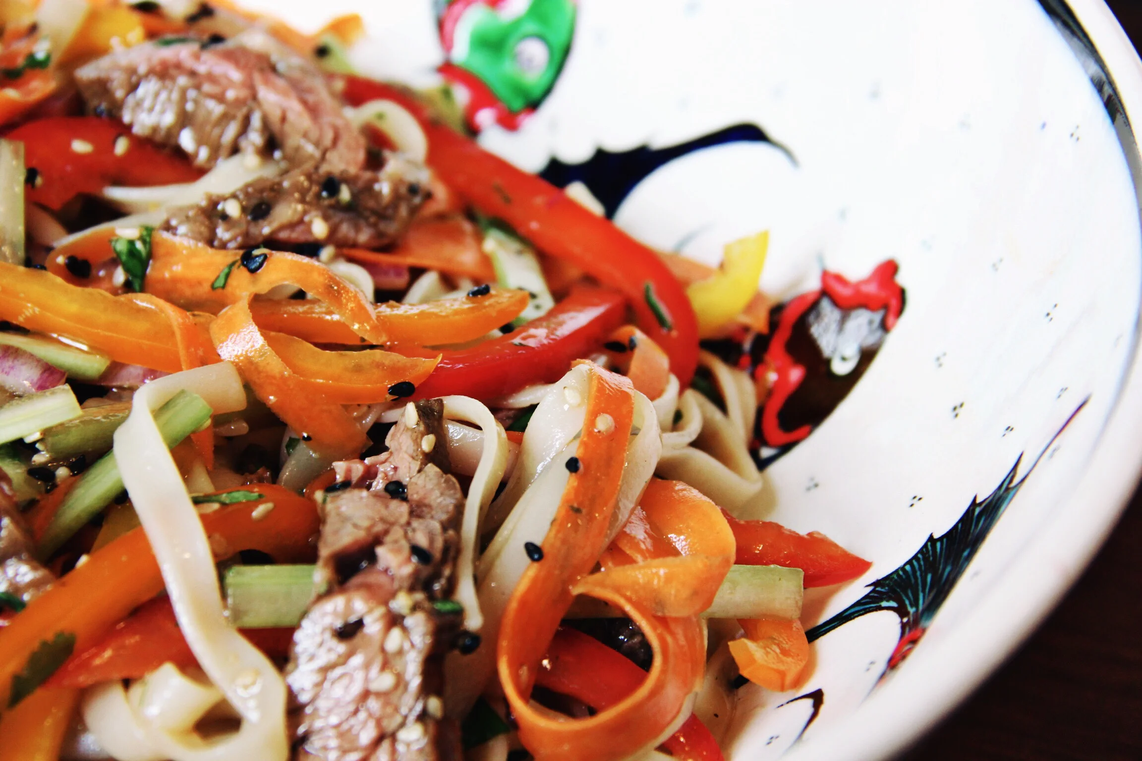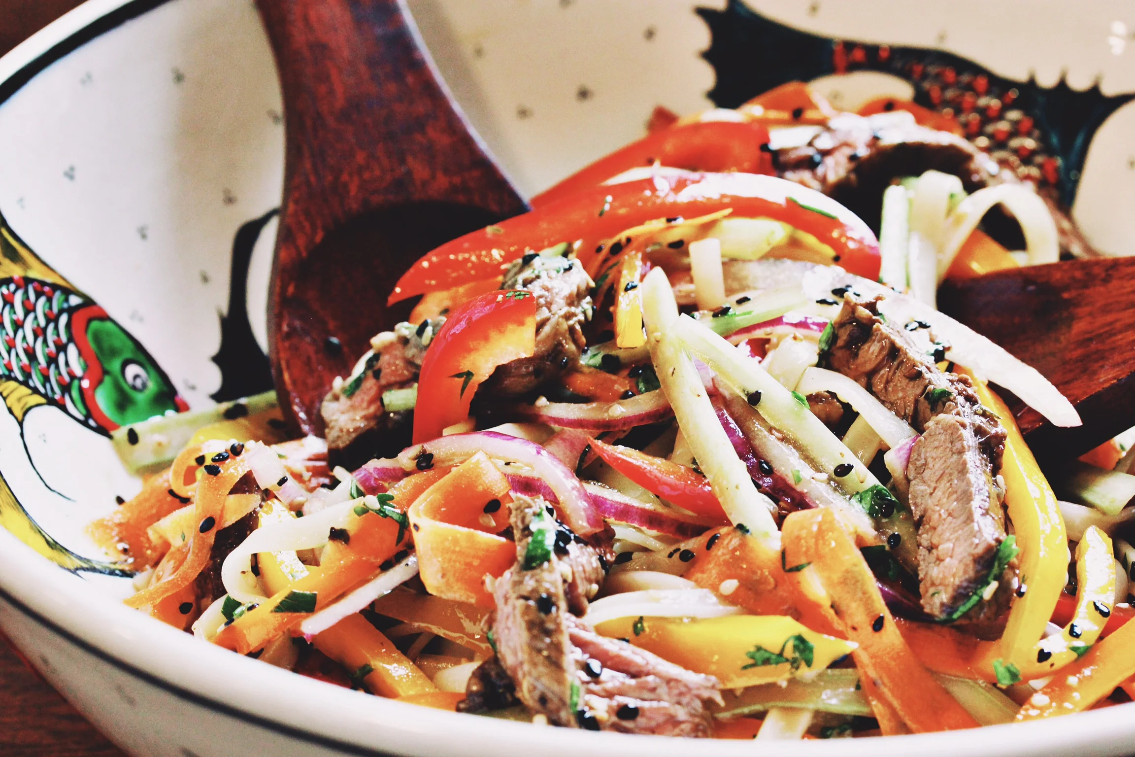 Cut steak against the grain into thin strips about 2-3 inches long. Add the steak to the veggie/noodle mixture and toss to combine. Pour remaining dressing all over and toss again to combine. Let flavors meld in the fridge for at least a couple of hours if you can, and then serve at room temperature.